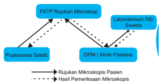 Untuk melakukan pemeriksaan dahak, tidak semua FKTP dapat melakukan pengambilan sampel, fiksasi sampel, maupun pemeriksaan sampel. Puskesmas dibagi menjadi FKTP satelit dan FKTP rujukan mikroskopis. Untuk penjaringan dahak, FKTP satelit membuat sediaan fiksasi dan merujuk sampel ke FKTP rujukan mikroskopis. Sedangkan FKTP rujukan mikroskopis dapat mengambil sampel dahak, melakukan fiksasi, dan juga melakukan pemeriksaan mikroskopis. Sedangkan untuk DPM, DPM akan merujuk secara langsung terduga TB ke FKTP rujukan untuk melakukan pemeriksaan dahak. Sedangkan Klinik Pratama, mirip dengan FKTP satelit, yaitu merujuk sediaan fiksasi yang sudah dibuat ke FKTP rujukan mikroskopis.